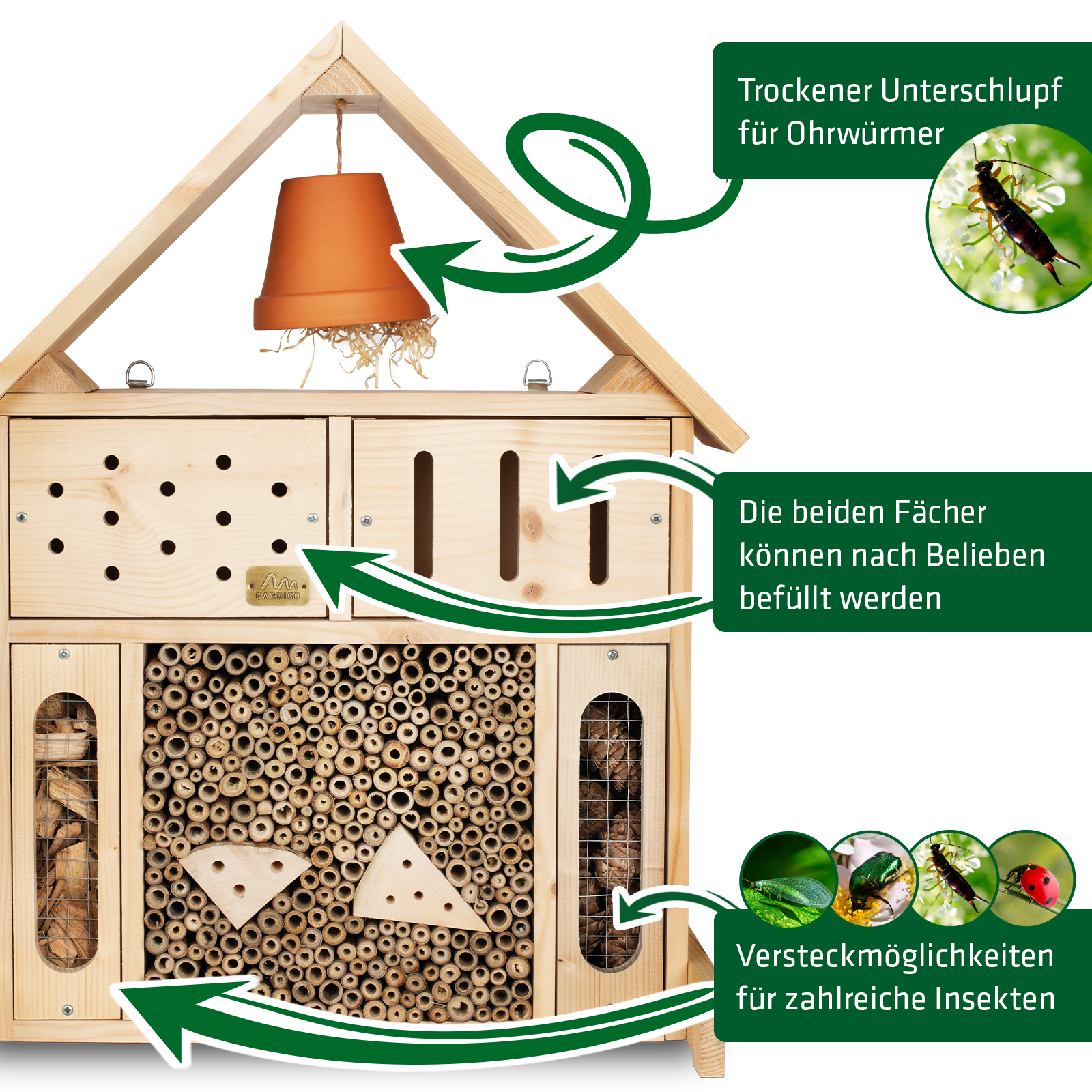 Das Insektenhotel XXL von Gardigo ist eine extra große Nisthilfe für Wildbienen und viele andere Insekten. Die kleinen Krabbler haben es nicht leicht: In unserer landwirtschaftlich geprägten Umwelt sind geeignet Brutplätze und trockener Unterschlupf Mangelware. Mit einem Insektenhaus kann aber jeder helfen. Im Gegenzug helfen die Insekten uns, denn Bienen, Marienkäfer, Ohrenkneifer, Florfliege, Schmetterling und co. sind wichtige Gartennützlinge.