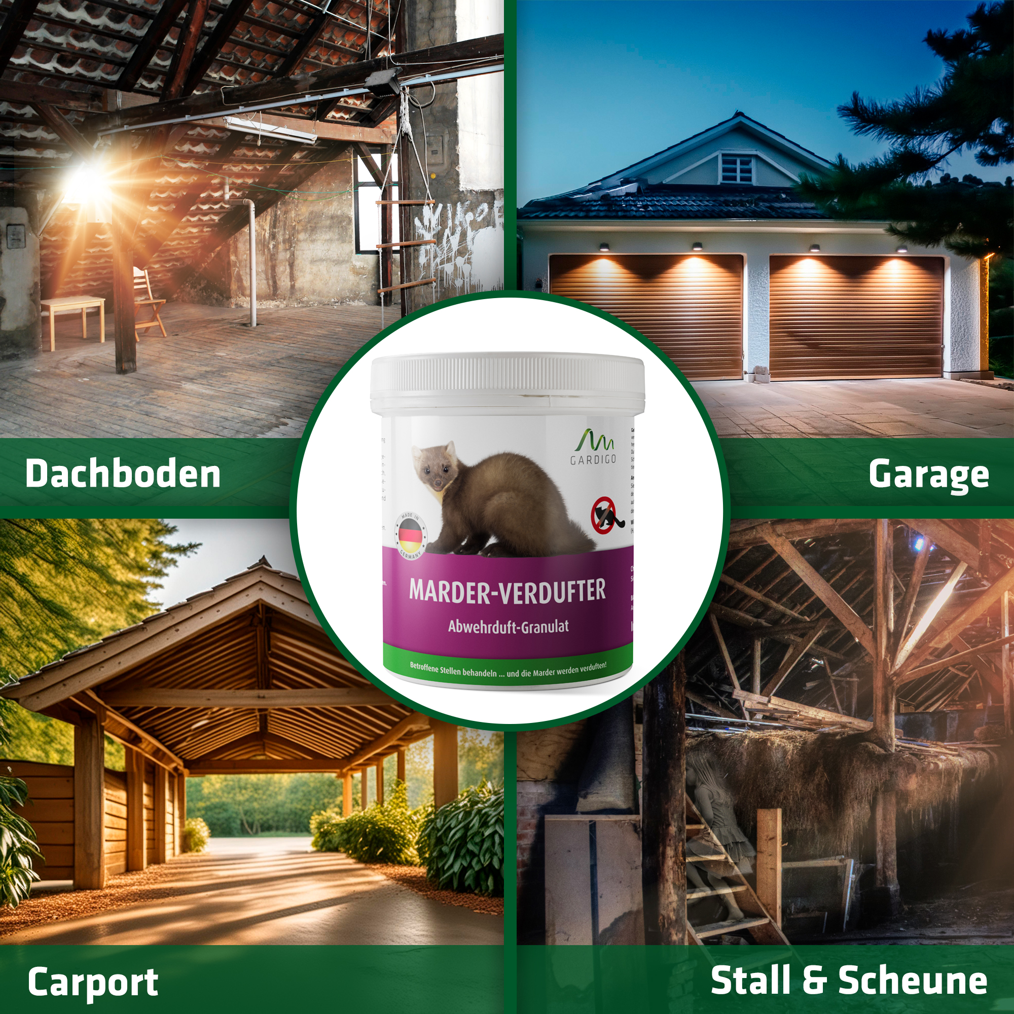 Mit dem Gardigo Marder-Verdufter bekommen Sie jetzt Ihr Marder-Problem in den Griff. Das Duft-Granult wird in Deutschland hergestellt. Idealerweise setzen Sie es als Mittel gegen Marder schon vorbeugend ein, in der Garage, unter dem Carport oder auf dem Speicher, um unerwünschte tierische Besucher fernzuhalten.