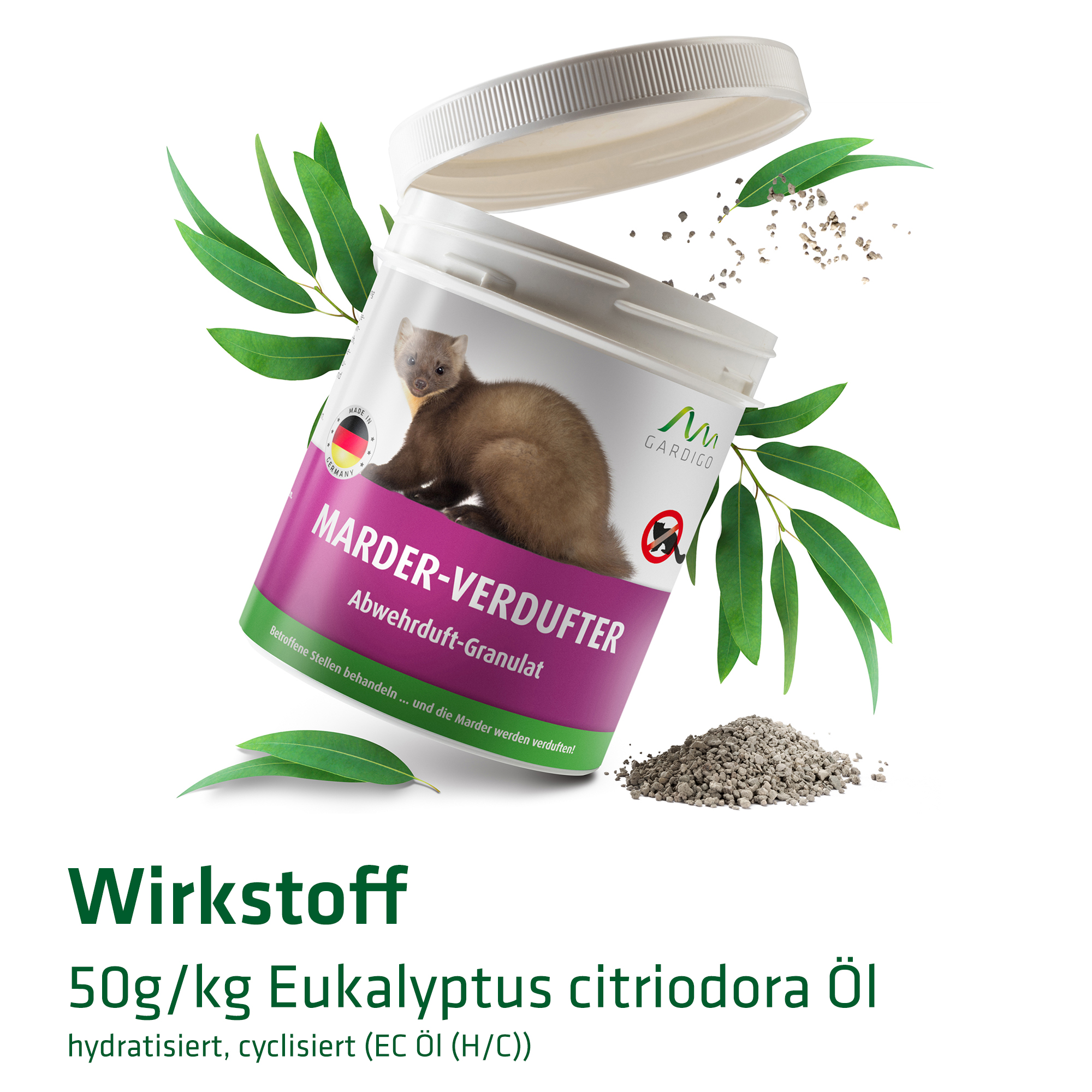 Das Marder-Verdufter Granulat von Gardigo vertreibt Marder mit dem Geruch des Wirkstoffs Eukalyptus-Citriodora-Öl. Für die empfindlichen Nasen der Raubtiere ist der Duft unangenehm und sie werden sich andere Aufenthaltsorte suchen.