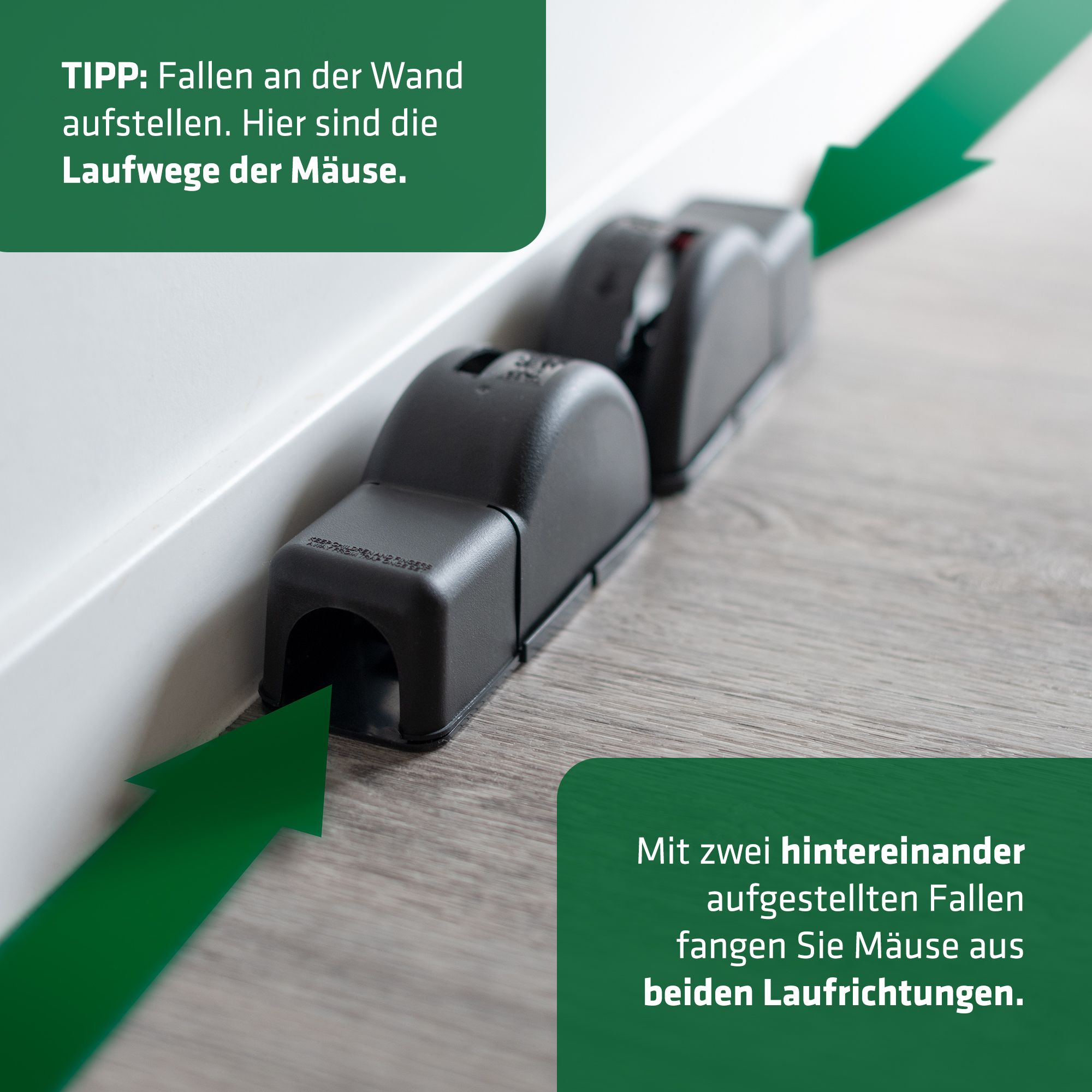 Am besten an der Wand. Die Laufwege der Mäuse erkennt man häufig schon durch Schmutz an der Wand und durch die Hinterlassenschaften der Tiere. Entlang der Wände bewegen sie sich, weil sie sich dort geschützt fühlen. Am besten stellen Sie zwei Fallen direkt hintereinander auf, eine in jede Laufrichtung ausgerichtet. Das hat auch den Vorteil, dass der Nager frontal auf die Falle zukommt und sie von dort auslöst. Im vorderen Bereich bringt der Schlagbügel die größte Kraft auf. So aufgestellt funktionieren Mausefallen am zuverlässigsten.