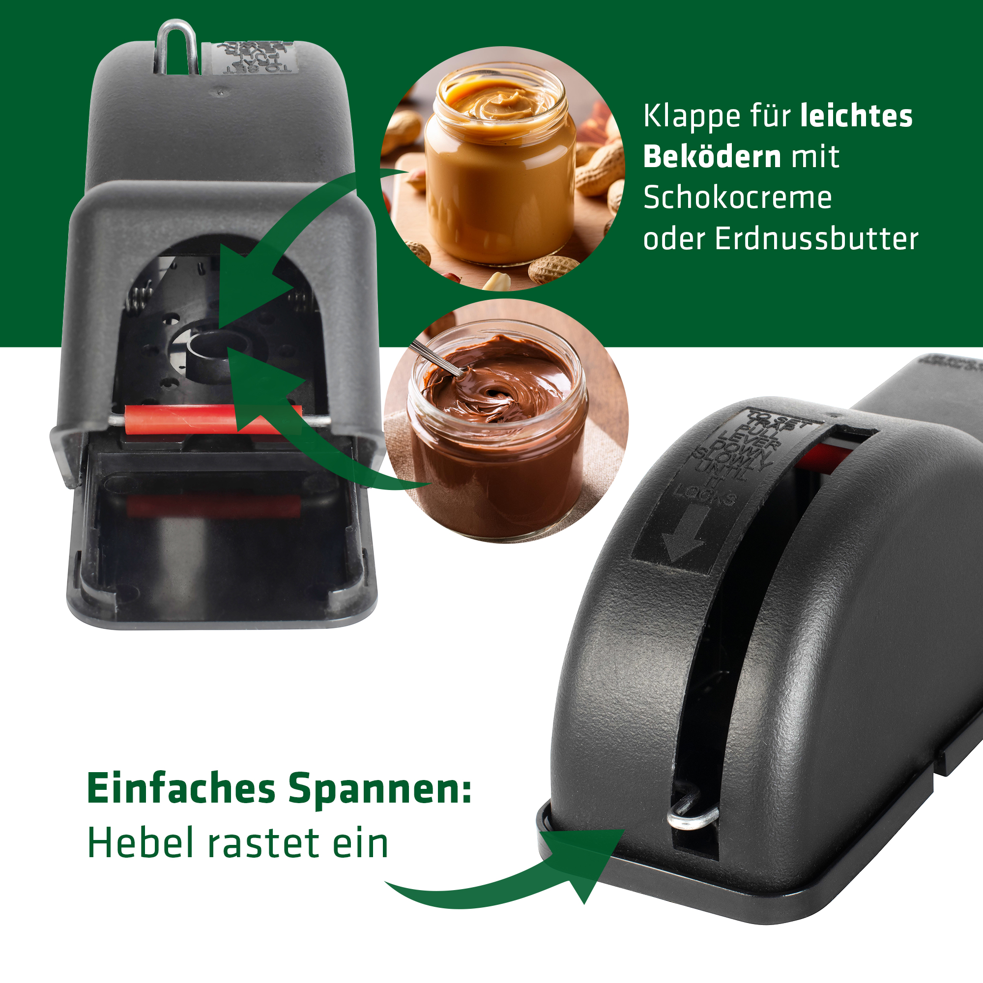 Diese Falle ist für streichfähige Köder optimiert, die in die Ködermulde gefüllt gegeben werden. Wir empfehlen Nuss-Nougat-Creme, Erdnussbutter oder Leberwurst.