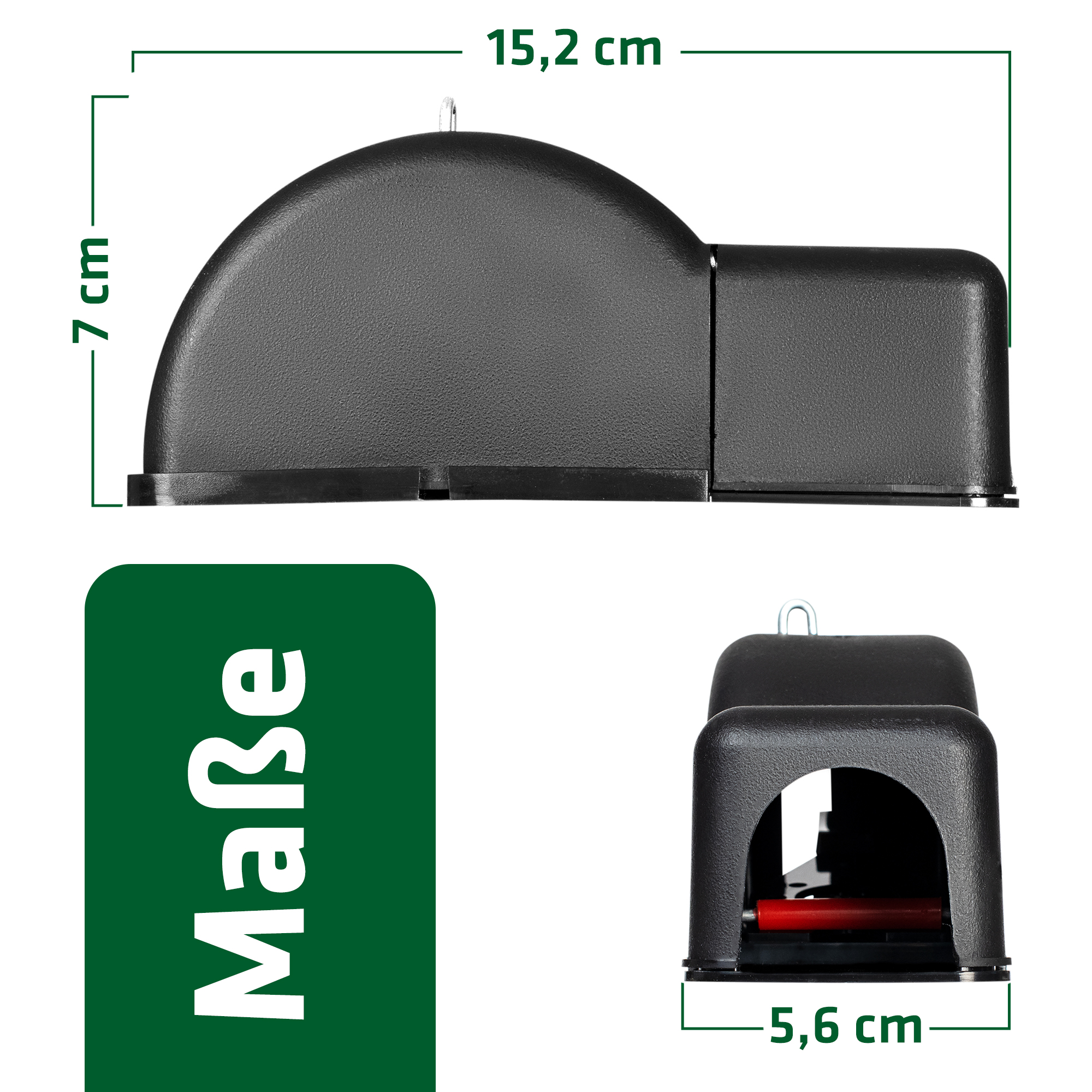 Schlagfallen sollten nicht offen herumliegen, besonders, wenn sie in Reichweite von Kindern oder Haustieren aufgestellt werden. Deshalb ist diese Falle bereits in ein Gehäuse integriert. So kann unbeabsichtigtem Auslösen und vielen Gefahrensituationen vorgebeugt werden.