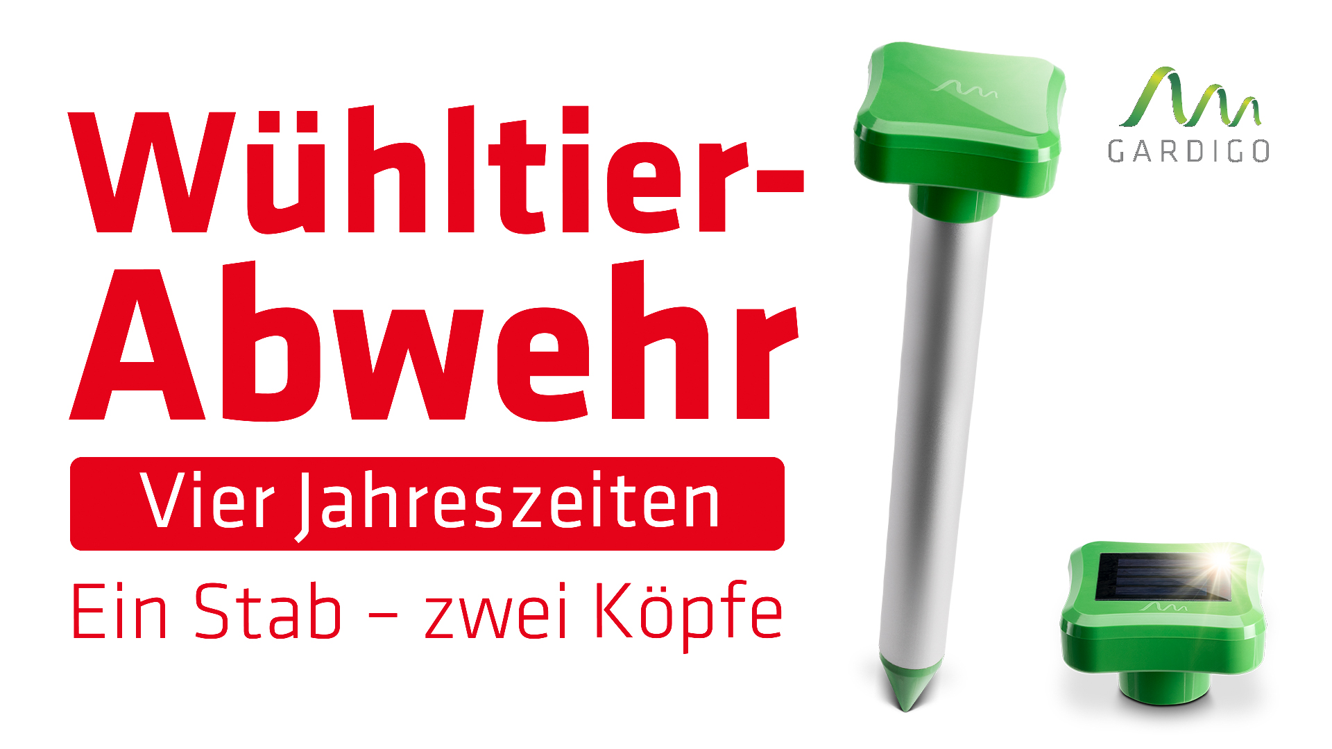 Fazit: Die Wühltier-Abwehrer „Vier Jahreszeiten" von Gardigo ermöglicht die Bekämpfung von Wühltieren über das ganze Jahr. Im Sommer läuft das Gerät mit Solarantrieb und in der dunklen Jahreszeit oder schattigen Bereichen mit Batterien, so könne die Wühler ganzjährig mit für sie störenden Geräuschen auf Abstand gehalten werden.
