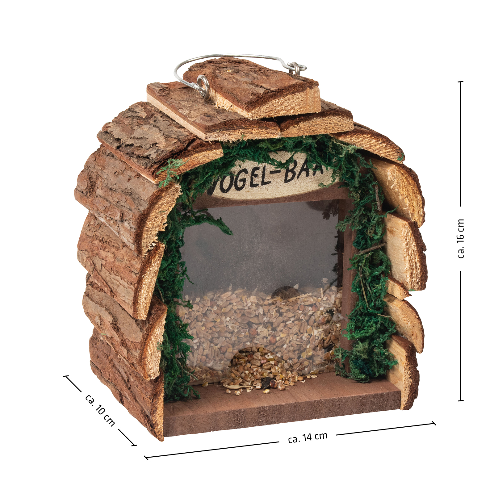 Mithilfe der Vogel-Bar können Sie Rotkehlchen, Finken, Dompfaff, Sperlinge und andere Vögel anlocken. Einfach eine bunt gemischte Körnerauswahl in das Häuschen füllen und Sie können die gefiederten Tierchen schon bald beobachten. Die Vogel-Bar rechtzeitig zum ersten Schneefall aufhängen. Zu diesem Zeitpunkt suchen sich Vögel ihre Futterstelle und bleiben ihr treu. Das Häuschen möglichst geschützt aufhängen, damit das Futter und die Tiere der Witterung nicht voll ausgesetzt sind.